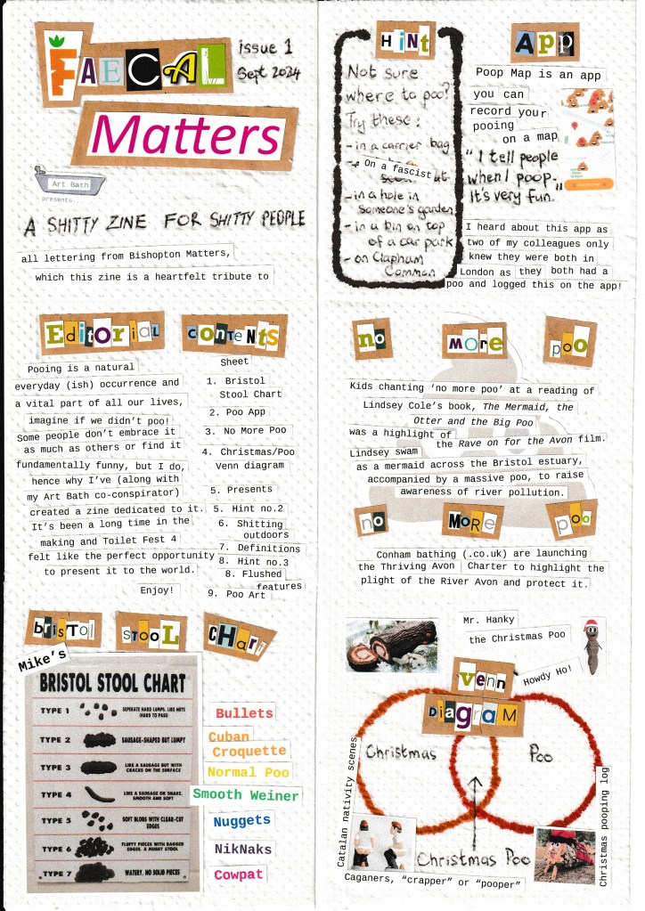 Toilet Fest IV saw the launch of Faecal Matters, a zine about poo by Art Bath made on toilet paper. It was distributed/sold rolled up in empty toilet rolls, collected since the idea of launching the zine at Toilet Fest came about. As many zines were made as there were empty toilet rolls and some were labelled with where they came from: the Cube; Bristol Bike Project; Fenton House; The Guild; and Supernormal festival. Amazingly 23 empty toilet rolls were collected and the recipients, many people playing at Toilet Fest IV and six “pre-orders”, are listed on a large empty toilet roll.