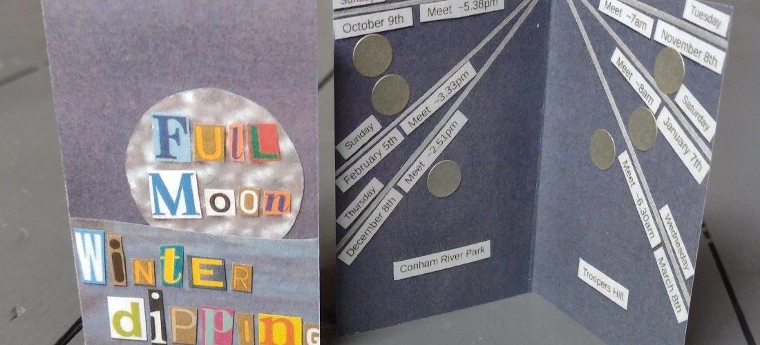 This winter I set up a Full Moon Winter Dipping club with the aim to swim at each full moon during winter. The swims took place at either the moon rise or moon set, which we watched from Troopers Hills before or after the swim in Conham River Park. I created a zine to celebrate the achievement of getting through the winter. Some photos of the zine are shown below (there were membership cards and stickers). The river was dangerously flooded for the January dip and for the March dip it was snowing, it was nowhere near as cold “swimming” in snow than the river had been, which was surprising!