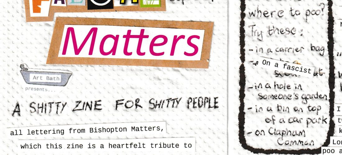 Toilet Fest IV saw the launch of Faecal Matters, a zine about poo by Art Bath made on toilet paper. It was distributed/sold rolled up in empty toilet rolls, collected since the idea of launching the zine at Toilet Fest came about. As many zines were made as there were empty toilet rolls and some were labelled with where they came from: the Cube; Bristol Bike Project; Fenton House; The Guild; and Supernormal festival. Amazingly 23 empty toilet rolls were collected and the recipients, many people playing at Toilet Fest IV and six “pre-orders”, are listed on a large empty toilet roll.